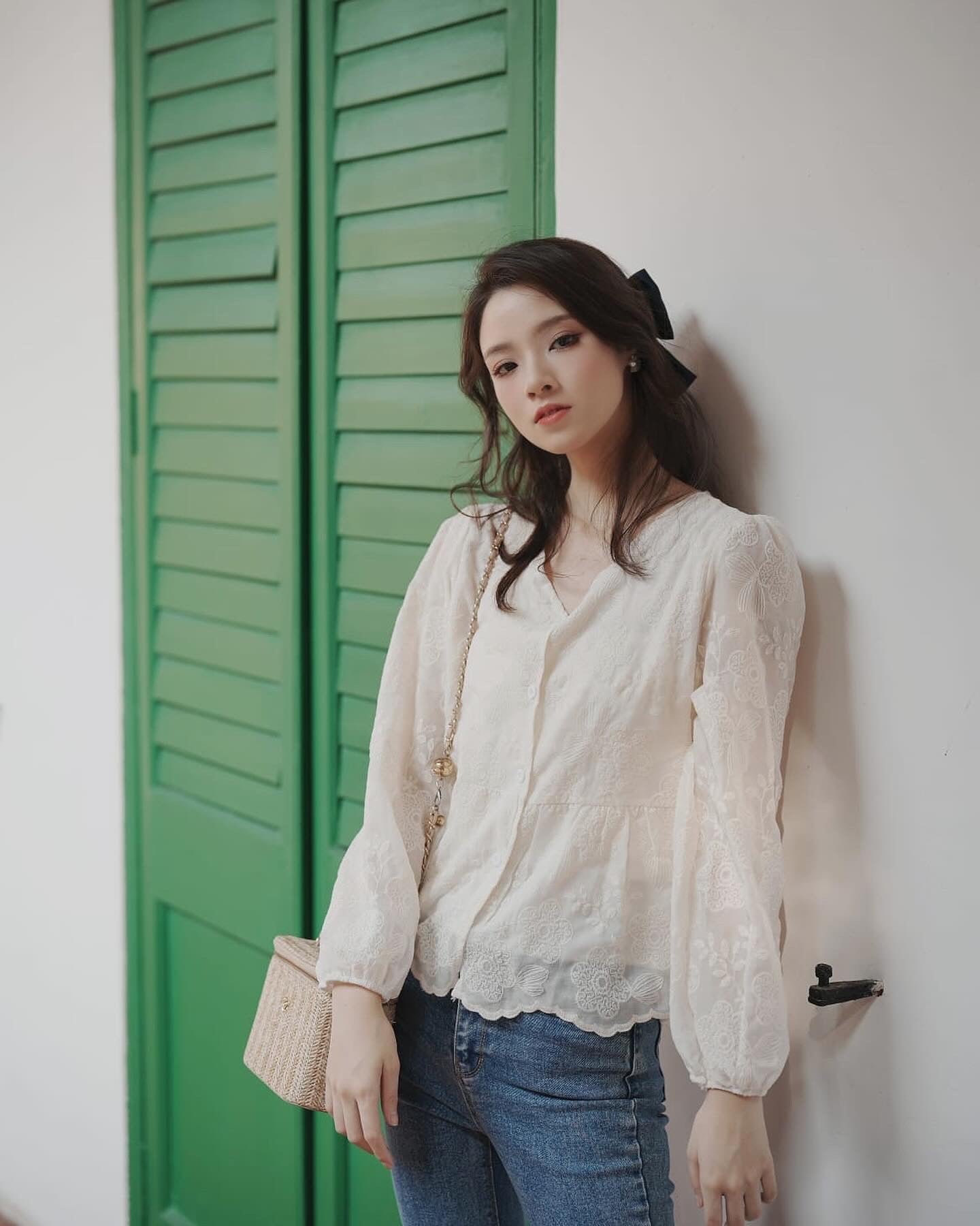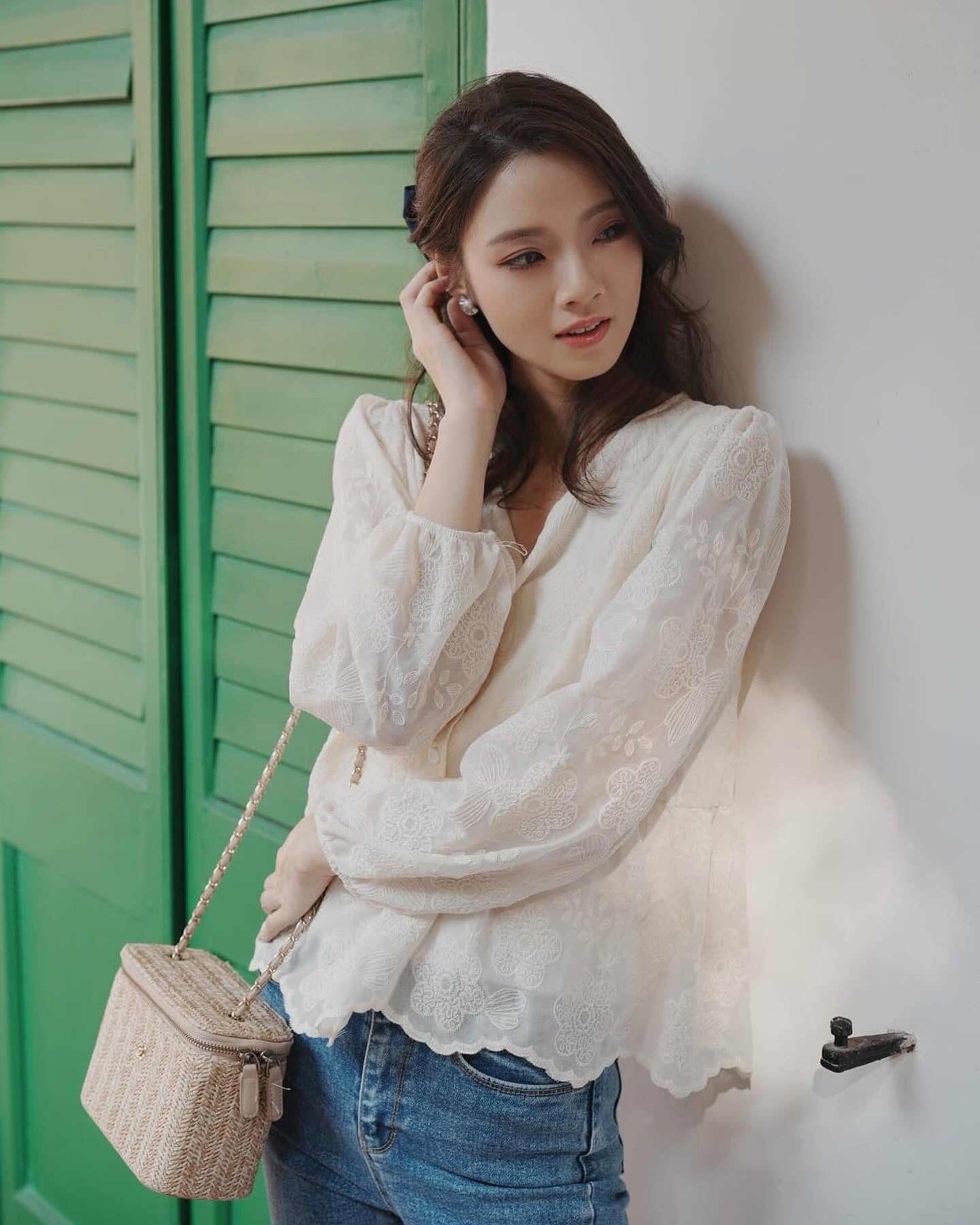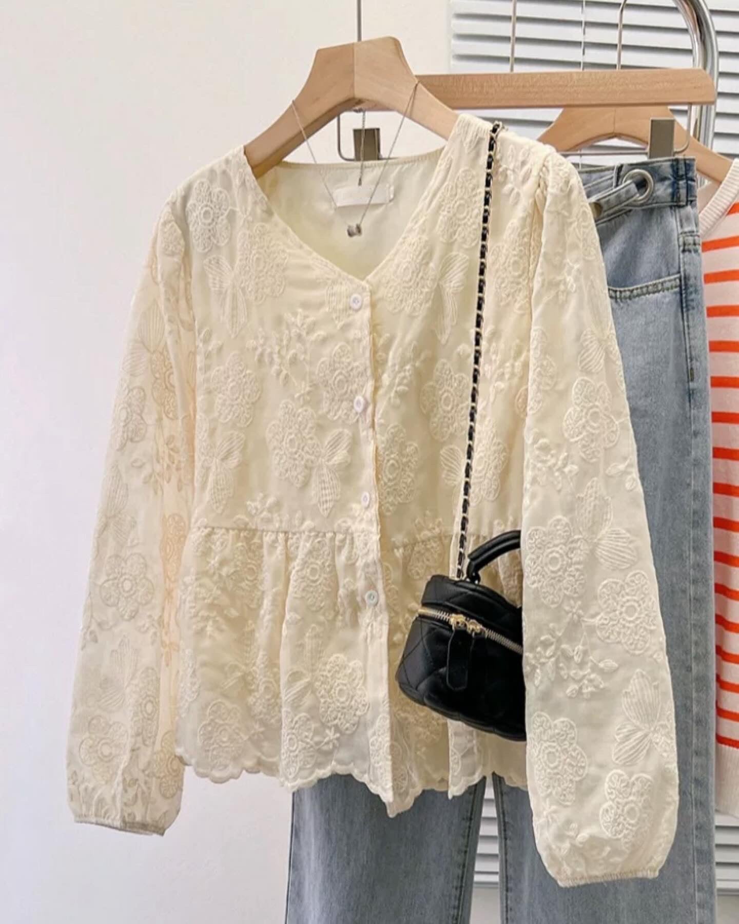 韓系V領小繡花收腰上衣