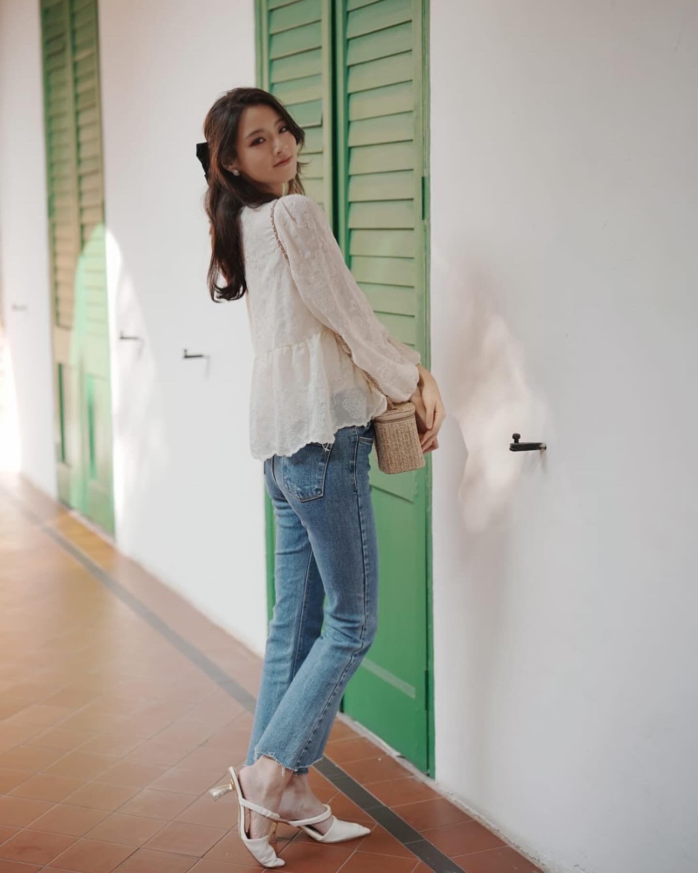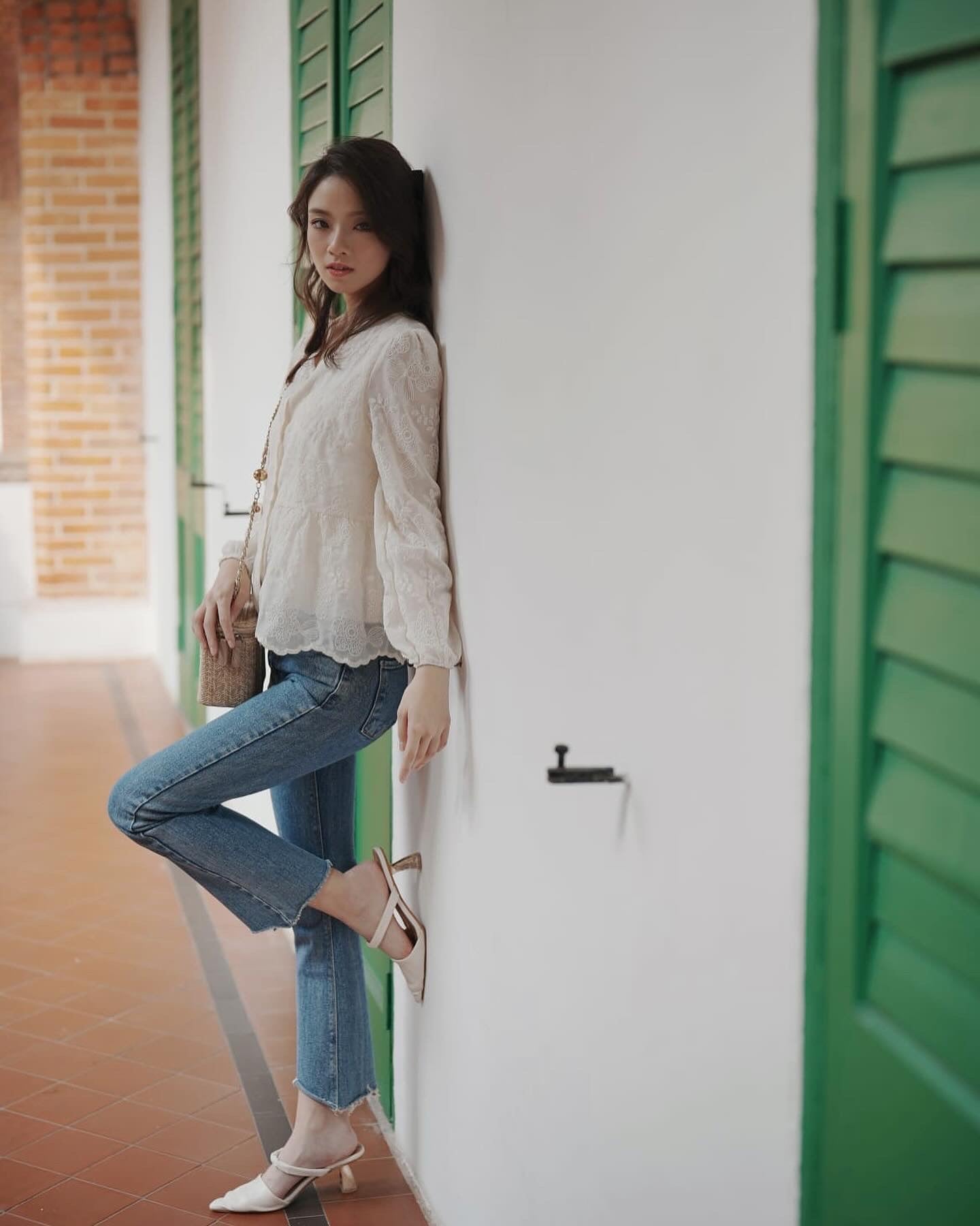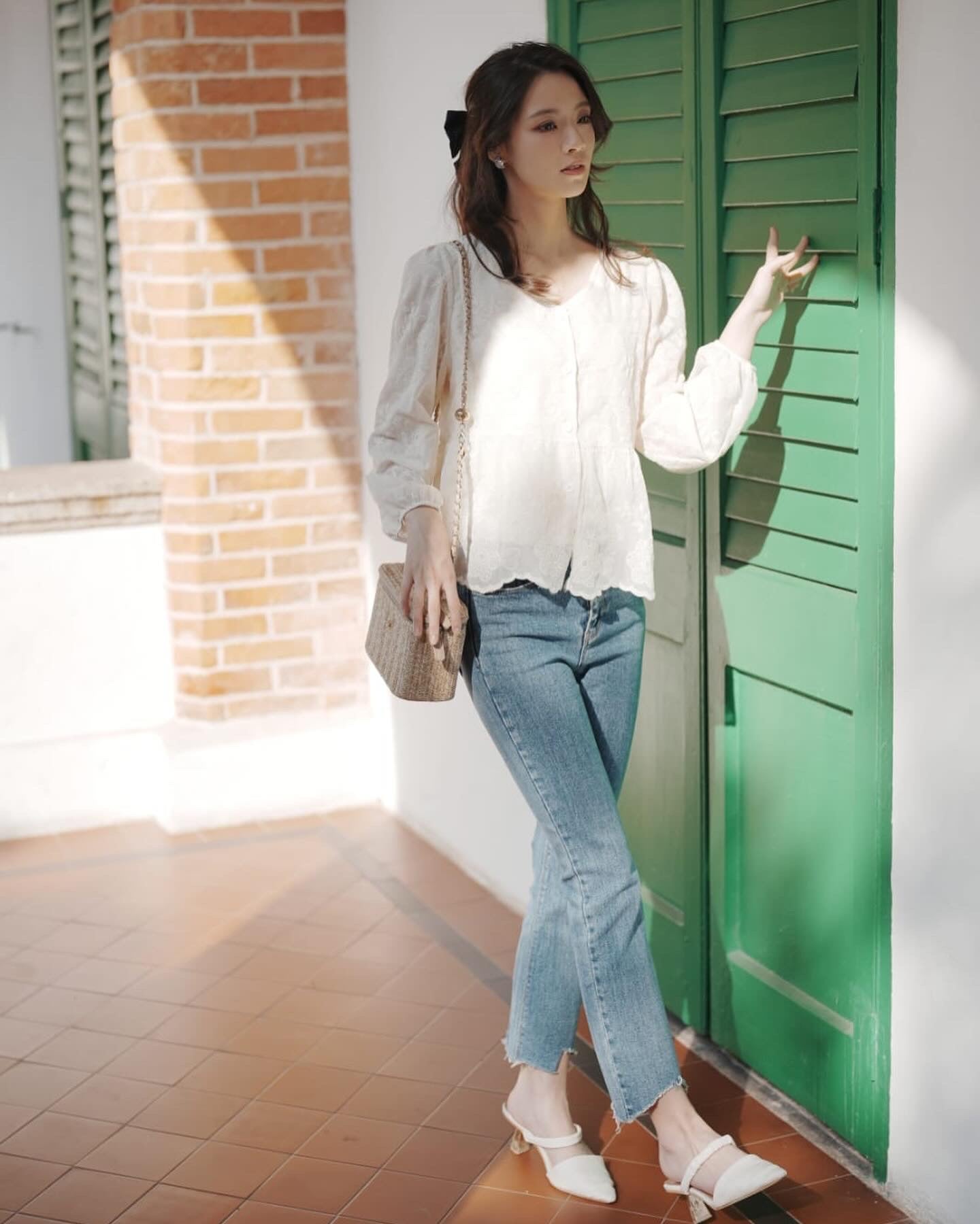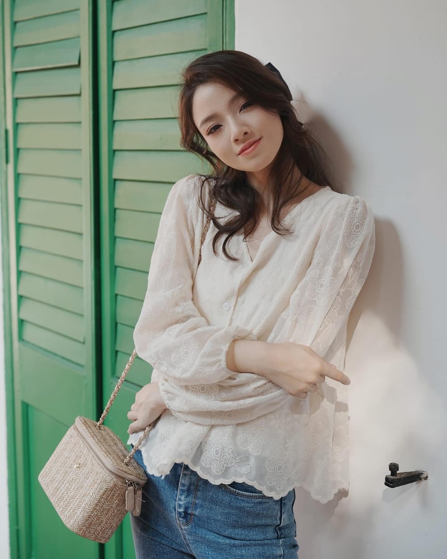 韓系V領小繡花收腰上衣